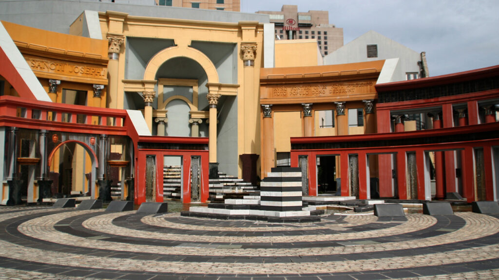 Moore 後期作品中對歷史的直接引用,則更清楚地落入 Frampton 所批判的場景化設計範疇。歷史元素不再作為可轉化為建築秩序的深層條件,而是被視為可自由取用的符號素材。古典語彙、裝飾圖樣與文化意象在此被抽離原有語境,經由拼貼與並置,被重新包裝為具娛樂性與戲劇張力的空間場景。建築因而更接近舞台裝置,而非源於構造倫理的場所生成。