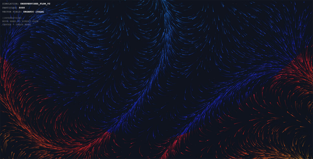 互動邏輯並不採取傳統的直接操控方式,而是建立在人類動作「擾動」系統本身的自然流場。核心流動由自律的混沌系統(Simplex Noise Flow)維持,而使用者的手勢僅作為向量外力注入,使原本的流動產生偏移、旋轉或局部聚集。透過「共舞式」的向量混合,人類並非主導者,而是一個干擾、激發、促使流體變形的能量來源。人與系統的互動更像在共同雕刻時間,或共同觸碰一塊不斷自我演化的柔軟物質。