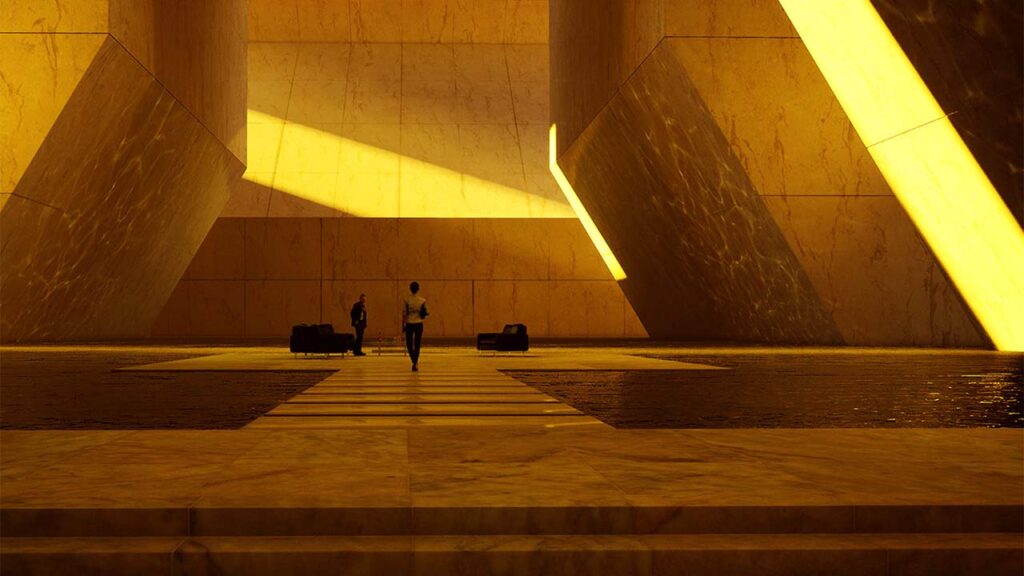 Wallace 總部在城市氛圍地圖中構成「高亮度、低密度、高壓力」的核心節點。空間完全封閉,缺乏窗戶與外部參照,光線彷彿自四面八方同時生成,失去可追溯的來源。牆面與地坪承接著持續變動的光影,呈現近似水面反射焦散的視覺效果,卻與任何實際濕潤環境脫鉤。視覺暗示流動,身體感受卻指向乾燥、空曠與靜止,形成明顯的感知斷裂。