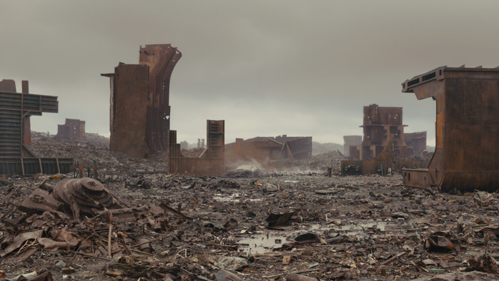 視覺特效團隊在此投注大量製作能量,重點不在宏觀壯觀,而在物質狀態的細節層次。垃圾並非模糊背景,而被拆解為多重表面。塑料的脆裂邊緣、金屬長期氧化後形成的不均勻鏽斑、油污在重力與時間作用下留下的黏滯流痕,以及塵埃反覆堆積後形成的灰階層次,皆以極高解析度被描繪。畫面不追求整潔構圖,而刻意保留視覺噪訊,讓觀看本身成為一種負擔。