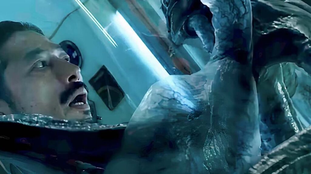 圖 4:Daniel Espinosa,《異星智慧》(Life),2017年。太空站內部的密閉艙室成為人類與火星生命體 Calvin 近距離接觸的場域。日本太空人秀村大輔(真田廣之飾)被困於透明隔離層另一側,身體與異質生命僅隔著一層可被穿透的薄膜。隔離層在畫面中同時作為保護介面與脆弱的臨界邊界,Calvin 的觸肢貼附其上並持續變異,顯示其對環境的快速適應能力。此場景常被視為電影中「生物性反噬」的關鍵節點:介面不再穩定地中介人與非人,而逐步轉化為失效的屏障。空間秩序由此從可控實驗環境滑向不可逆的生存危機,揭示當生成系統具備自主演化能力時,治理與隔離所面臨的結構性風險。圖片來源:© 2017 Sony Pictures Entertainment。本圖片為電影劇照,僅供學術研究與評論用途。