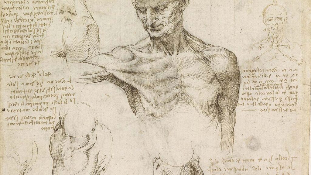 圖 2:Leonardo da Vinci(1452–1519),《解剖習作:男性軀幹與肩臂肌群研究》(Anatomical Studies of the Shoulder and Neck),約 1510–1511 年,金屬尖筆與墨水於紙(silverpoint and pen and ink on paper)。畫面以高度精確的線條與交錯排線刻畫胸鎖乳突肌、三角肌與胸大肌等結構,並在人體周圍佈署鏡像手寫註記,將觀察、測量與推論同步編入同一張紙面。此作所展現的並非再現性人體藝術的理想化,而是將身體視為可被拆解、可被驗證的機械系統,知識在此不依賴象徵敘事,而建立於圖像操作與局部構造的可讀性之上。透過繪圖與註記的耦合,Leonardo 將視覺表徵轉化為研究方法,標誌文藝復興知識生產從古典權威轉向經驗實證的關鍵步驟。現藏於英國溫莎城堡,英國皇家收藏(Royal Collection Trust);圖片來源:pbs.org,僅供學術研究與評論用途。