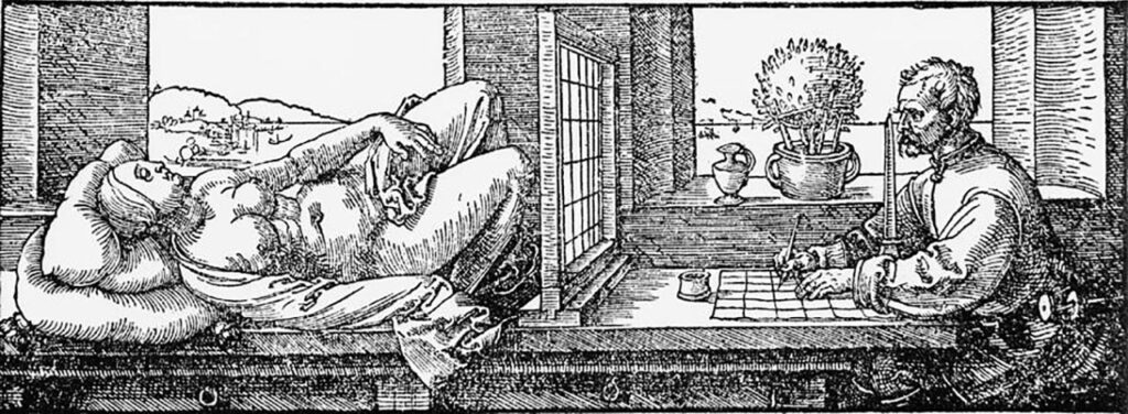 圖 3:Albrecht Dürer(1471–1528),《以網格裝置描繪躺臥裸像》(Draughtsman Drawing a Reclining Nude),約 1525 年,木刻版畫。畫面中,畫家以固定視點對應網格框架,將躺臥女性身體切割為可被逐格轉譯的比例單位,視覺經驗在此被轉化為可計算、可複製的描繪程序。裝置同時隔離觀看者與對象,將凝視從直接的感官接觸改寫為經由工具中介的抽樣與映射。此作不僅展示文藝復興後期的透視技術,更揭示再現如何逐步成為一種操作系統:身體被幾何化,空間被編碼化,繪畫轉向以規則支配的生成程序,預示後來影像技術與計算視覺在歷史中的制度性基礎。圖片來源:fineartamerica.com,僅供學術研究與評論用途。