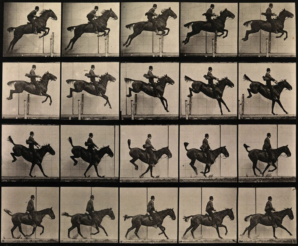 圖 9:Eadweard Muybridge(1830–1904),《奔跑中的馬(跨越障礙)》(The Horse in Motion, “Sallie Gardner” at a Gallop),1878 年,連續攝影(動作分解照片,攝影版印)。作品以多格連拍將騎馬跨越瞬間拆解為可逐格比對的時間序列,肉眼難以辨識的運動細節被轉化為可測量的影像證據,徹底改寫傳統繪畫對動態的想像模式。此種以機械取樣生成的時間切片,將「動作」從敘事表現拉回到技術記錄與分析操作之中,影像不再是再現的結果,而成為捕捉、拆分與重組運動的視覺裝置。Muybridge 的研究不僅奠定電影與動畫的時間基礎,也標誌現代視覺文化從單幅凝視轉向序列化、可計算的感知制度,為後來的影像自動化與資料化觀看開啟關鍵前提。圖片來源:britannica.com,僅供學術研究與評論用途。