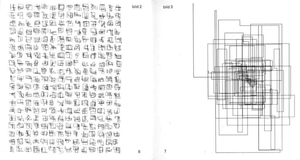 與觀念藝術並行的,則是控制論(Cybernetics)脈絡下逐步成形的早期計算機藝術 11。當藝術家開始面對計算機這一全新的生成媒介,創作不再只是材料與手工技藝的問題,而成為程序、規則與輸出之間的關係配置。大型主機與繪圖儀(Plotter)進入藝術現場後,圖像首次以純粹運算的形式被生產,線條不再由手的觸覺推進,而由指令與機械運動共同完成。藝術家所操作的不再是顏料與筆觸,而是參數、迴圈、機率與座標。繪圖儀的筆尖在紙面上滑行時,呈現的已是演算法運行後的可視化痕跡。