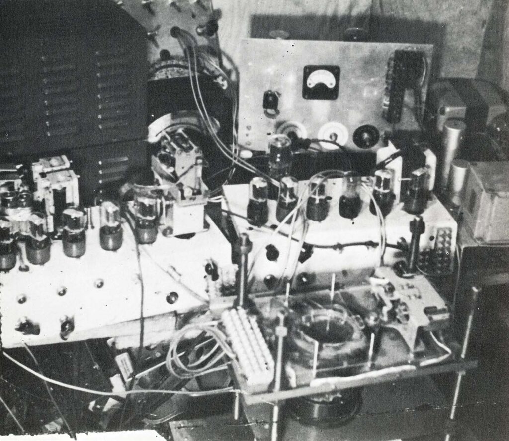 Pask 在 1950 年代發展的 MusiColour 實驗裝置(圖 4),展示了對話理論在實驗層面的實際運作。 MusiColour 系統能夠即時回應音樂演奏,將聲音轉譯為光的變化。當演奏者反覆輸出單調節奏,系統會逐漸降低回應強度,最終停止運作,迫使音樂家改變演奏策略。機器在此並非被動工具,而呈現出可被感知的偏好與反應模式。互動因此成為雙向調整的過程,創作不再由人類單方面主導。