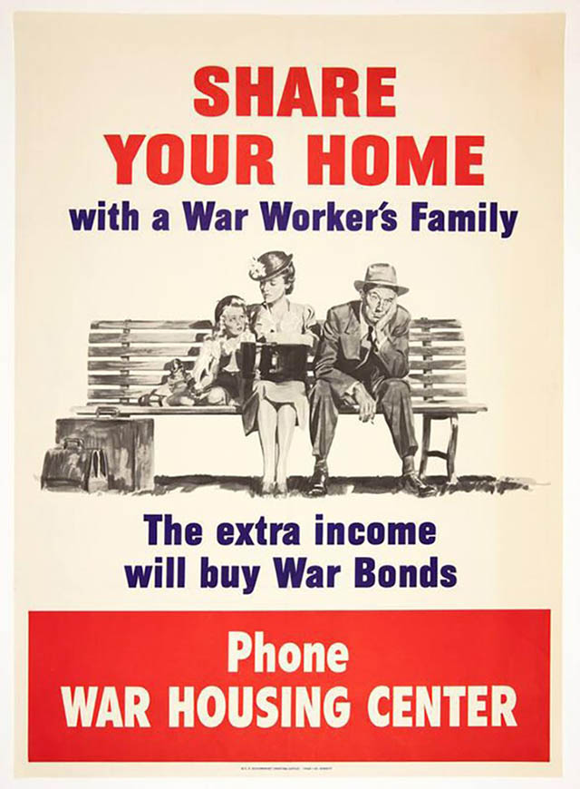 戰爭期間,木材、鋼鐵、銅等建材被優先用於軍需,民用住宅建設幾乎停滯。國防工人湧入如波特蘭等城市,形成國家住房局所稱的「史詩級遷徙」。政府最初以建造臨時工人住宅、分隔單戶住宅為多戶出租、實施租金管制等手段應對。臨時住宅的材料用量比戰前減少 80%,永久建築也減少 60–70%,反映出當時的「節約原則」。波特蘭北部的 Vanport 社區曾容納多達 4 萬人,但仍無法從根本解決問題。政府進一步推動「分享你的家」(Share Your Home)運動,鼓勵市民提供閒置空間(圖 1)。