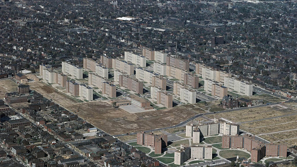 聖路易斯市在 1940 年代亦面臨類似壓力。約 85,000 戶家庭居住於破舊公寓,生活條件惡劣。白人中產階級外移後,低收入族群承接原有住宅,導致城市稅基衰退、市區人口流失。為遏止市中心地價崩跌,市府啟動「城市更新」政策,清除貧民窟、建設高密度社會住宅。1937 年與 1949 年的《住房法案》(Housing Act of 1937,  Housing Act of 1949) 提供聯邦資金,反映政府延續戰時節約思維,強調「快速解決」勝於社區永續營造,埋下後續維護不善與社會隔離的隱患。