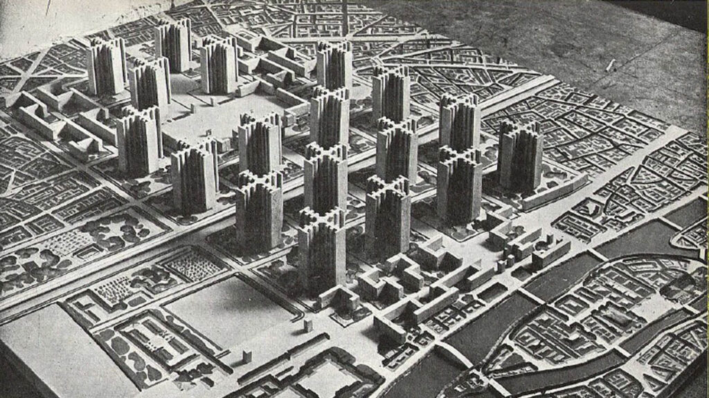圖 3:Le Corbusier(1887-1965)「光輝城市」(Ville Radieuse)都市計畫模型,約 1930 年代。模型呈現大量等距排列的高層住宅塔樓,置於寬闊綠地與幾何化交通網絡之中,象徵以功能分區、集體居住與機械化效率為核心的都市理想。中央行政區與四周住區的對位構圖反映出高度理性化的治理邏輯。後來的公共住宅,如《普魯伊特-艾戈》(Pruitt–Igoe)或《卡布里尼–格林》(Cabrini–Green, 1962),在不同程度上繼承了這種形式語彙,也在實踐中暴露出形式秩序與社會運作之間的張力。圖片來源:architectuul.com。