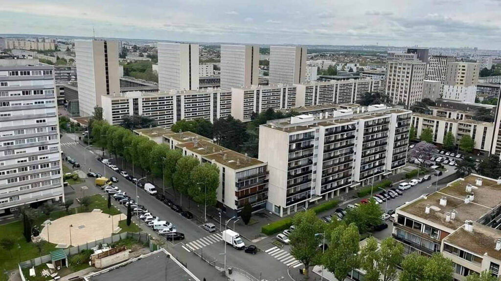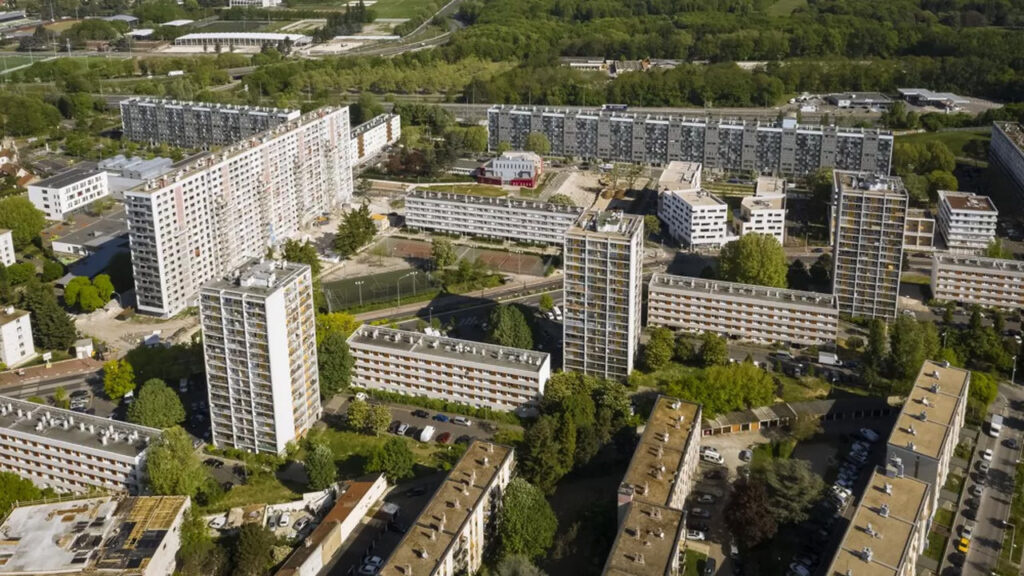 圖 7:巴黎北郊《拉庫爾訥沃》(La Courneuve)大型公共住宅群,1964 年啟用。影像呈現戰後法國「大集合住宅」(grands ensembles)高度標準化、板樓密集排列的都市景觀。《拉庫爾訥沃》是法國最具代表性的集中式社會住宅開發之一,體現以工業化建築技術、功能分區與國家規劃體系回應住房短缺的政策思維。隨著社會與經濟條件變化,這座住宅群逐漸暴露出空間單一化、社會排除與治理困難等問題,在法國都市更新史中成為持續被討論與再開發的核心案例。圖片來源:lesechos.fr。