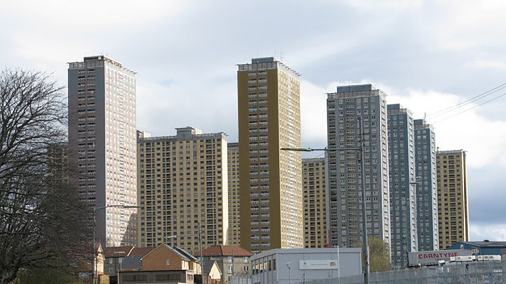 圖 8:蘇格蘭格拉斯哥《雷德路高樓群》(Red Road Flats),1966 年完工。畫面呈現由多棟超過 30 層的高層住宅組成的密集住宅帶,構成英國戰後「高樓解決住房短缺」政策的典型象徵。《雷德路高樓群》以鋼框架與預鑄板材快速施工,體現當時強調效率與規模的國家建設思維。然而,隨著建築老化、管理失序與社區斷裂等問題累積,該住宅群逐漸被視為都市邊緣化與現代主義理想破裂的代表案例,並於 2012–2015 年間分期拆除。圖片來源:wikimedia.org。