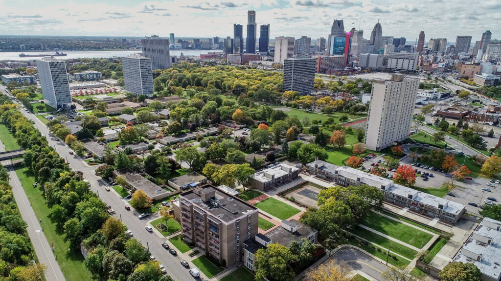 圖 9:美國底特律《拉法葉公園》(Lafayette Park),1959 年完工。由 Ludwig Mies van der Rohe(1886-1969)、Ludwig Karl Hilberseimer(1885-1967)及景觀設計師 Alfred Caldwell(1903-1998)共同規劃的住宅與公園組合,為北美最成功的現代主義都市更新案例之一。畫面可見高層住宅、低層聯排住宅與大尺度綠帶交織的空間配置,展現 Mies 所追求的透明性、秩序與輕盈結構。《拉法葉公園》在戰後衰退的底特律中長期維持高度居民留存率與良好治理,被視為對比《普魯伊特–艾戈》等公共住宅失靈的「例外」,顯示現代主義在特定社會條件下仍具可持續性。圖片來源:parclafayettedetroit.com。