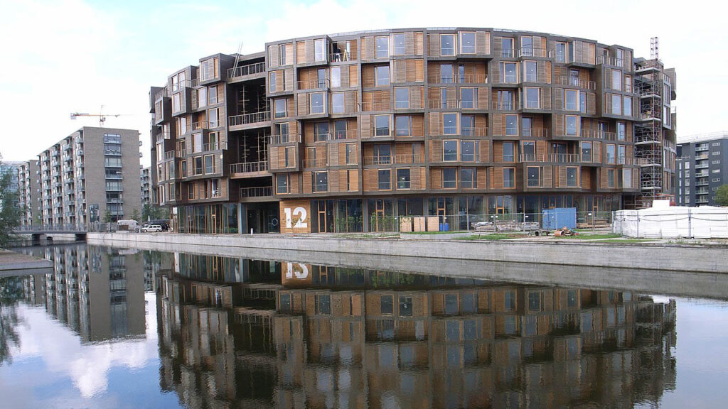 圖 12:丹麥哥本哈根《提特根學生宿舍》(Tietgenkollegiet),2006 年完工。由丹麥建築事務所 Lundgaard & Tranberg 設計,整體以環狀量體組構學生生活空間,中央庭院作為共享社交核心。外立面以木質窗框與交錯開口形成動態節奏,展現北歐當代設計對材料、尺度與人際互動的重視。《提特根學生宿舍》常被視為公共性住宅的新典範,以「集體生活」與「可持續材料」回應戰後大規模住宅所暴露的社會與空間斷裂問題。圖片來源:wikipedia.org。