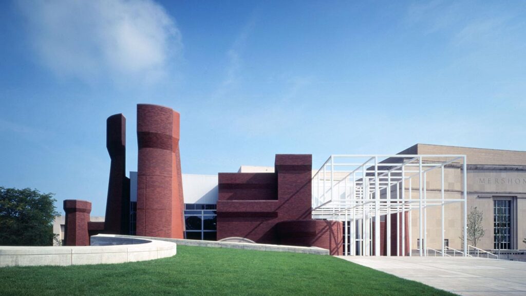 在都市與校園層級,《魏斯納藝術中心》的形式語彙亦與周邊環境形成明顯對照。鋼構與斷裂節奏對比哥倫布市與校園慣用的磚石材料與對稱秩序,去脈絡化的策略試圖脫離地域與歷史約束,卻也削弱了與日常使用經驗之間的連結。建築高度自律的姿態提高了理解門檻,空間更接近需仰賴專業訓練才能解讀的學術文本,而非自然融入生活的公共文化場所。