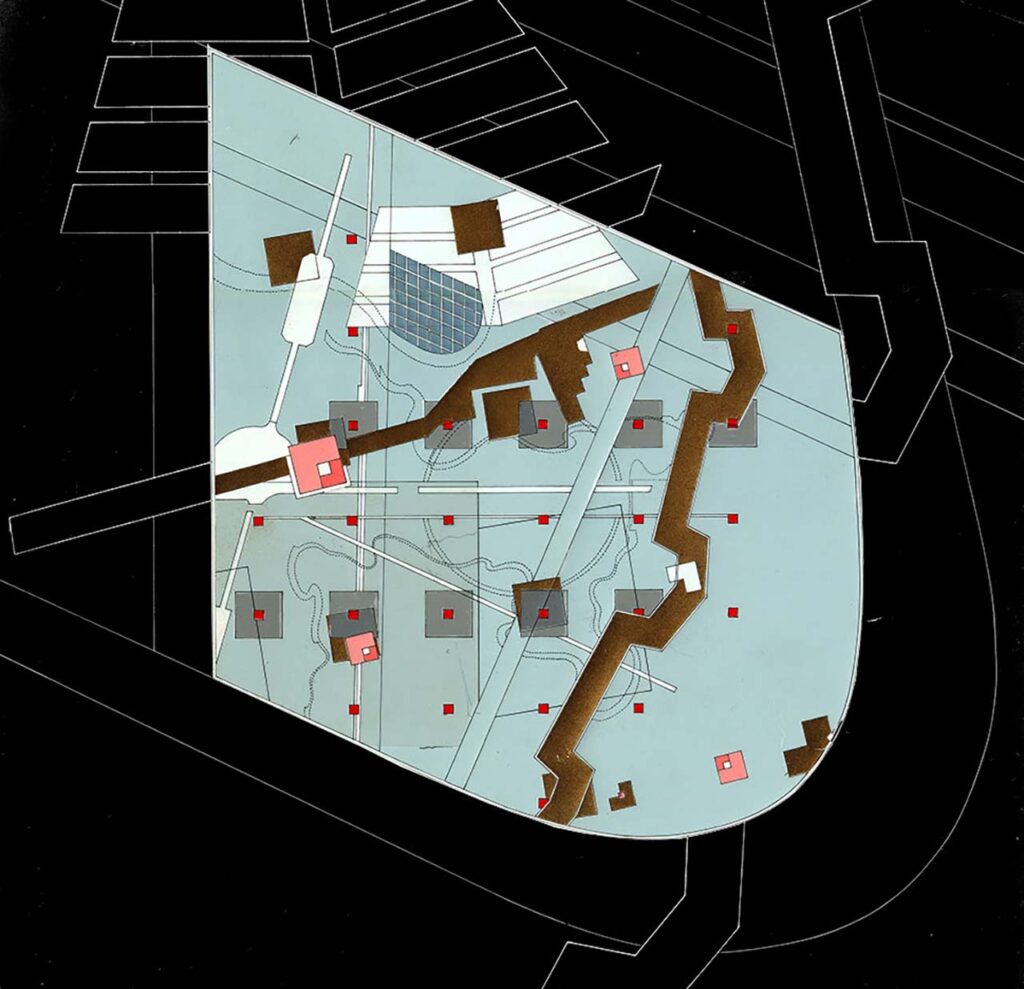 Eisenman 與 Derrida 的合作,尤以《拉維萊特公園》(Parc de la Villette, 1982–1983)競圖計畫最具代表性(圖 1)。該方案並未追求空間的整合或象徵秩序,而透過網格錯置、路徑斷裂與概念疊加,嘗試在建築層面呈現「缺席的在場」(presence of absence)。此處的在場不透過實體確認,而經由缺失與偏移被間接指認。哲學在此不再停留於文本,而進入圖表、平面與操作系統之中。