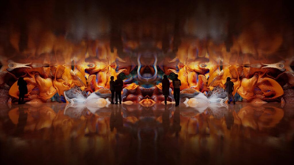 在 Anadol 與 teamLab 的沉浸式展演面前,此批判獲得新的急迫性。Anadol 的資料影像依賴高強度演算與視覺工程,影像以巨幅投影呈現龐大資料場的運動,觀眾被包覆在連續變形的視覺環境內。感知被集中在由演算法塑造的圖像流之中,觀看行為轉向接受演算節奏,難以保持距離,也難以干預生成。影像規模與技術震撼在無形中削弱了批判性,使觀看成為身體被動融入資料流的過程。