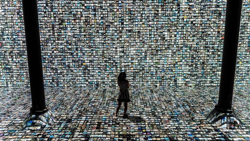 RAS 的商業運作結構具有高度彈性,由公共藝術委託、機構展覽費用與 NFT 銷售共同形構。工作室在 Web3 的萌芽期便開始實驗鏈上發行模式,《機器夢境》(Machine Hallucinations, 2016–)系列(圖 2) NFT 隨後累積可觀的資金規模,為 RAS 持續維持大型技術團隊提供穩定來源。直接面向藏家的融資方式使 RAS 能保持財務自主,維持規模化的技術團隊,而不完全依賴畫廊體系。多軌並行的收入模式也使 RAS 具備科技企業般的成長曲線,使藝術創作與基礎設施建置形成彼此強化的循環。