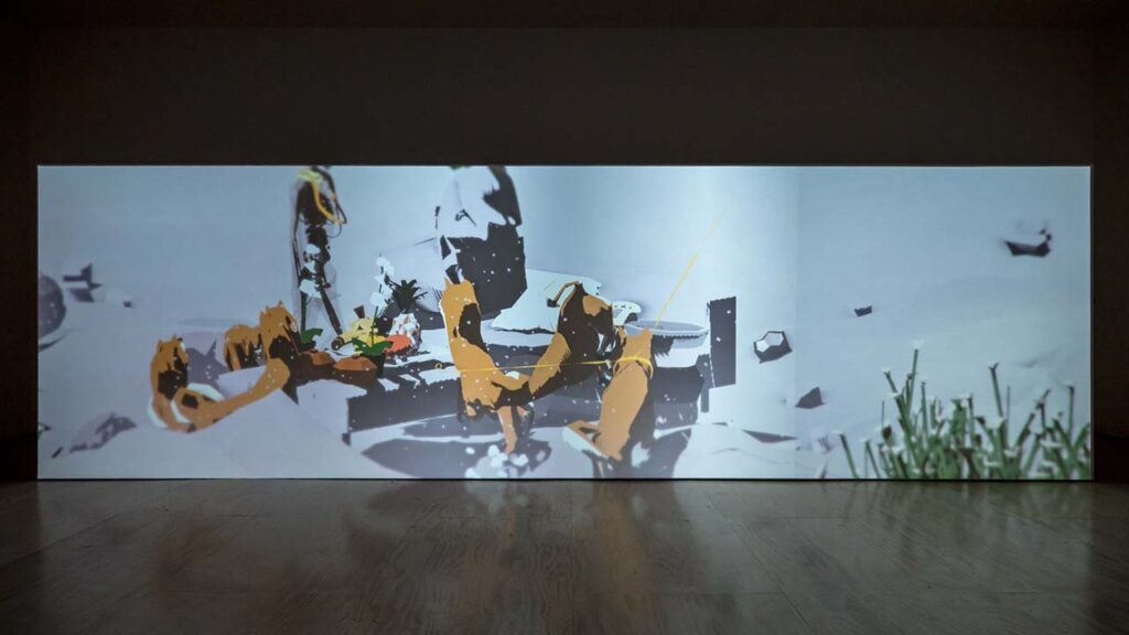 Cheng 反覆強調「模擬」(simulation)與「動畫」(animation)的根本區別。動畫依循預先編排的指令,形成確定性的影像序列。模擬則依賴即時運算,行為軌跡由系統內部規則與外部刺激共同產生,展現不可預測性。《使者》(Emissaries, 2015–2017)三部曲展示了此方法(圖 4),AI 代理在虛擬生態中透過互動與學習形成湧現敘事。