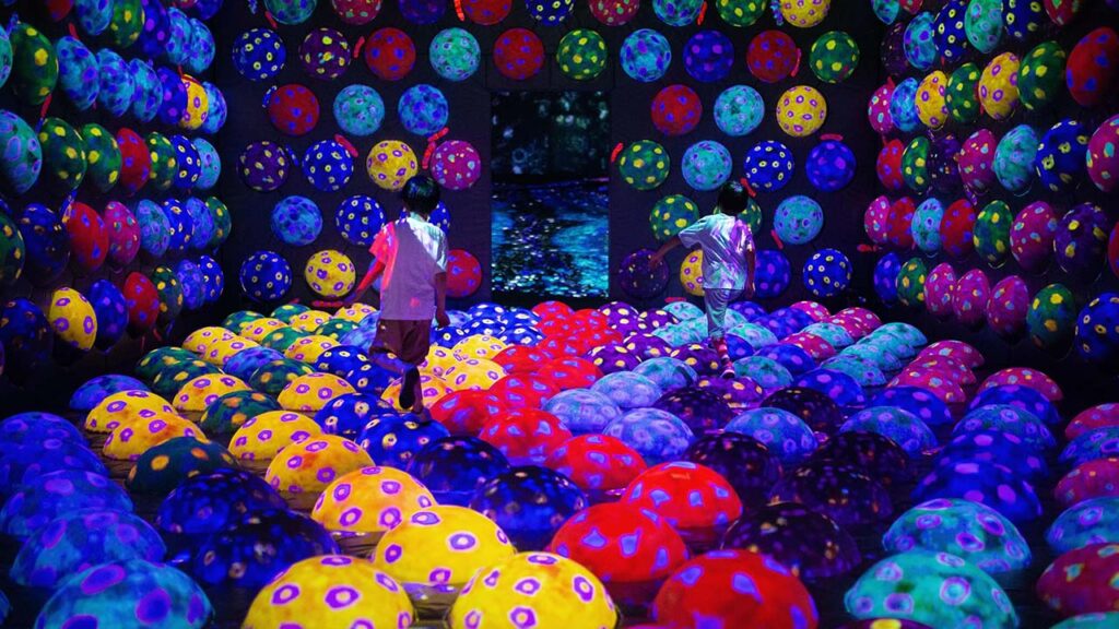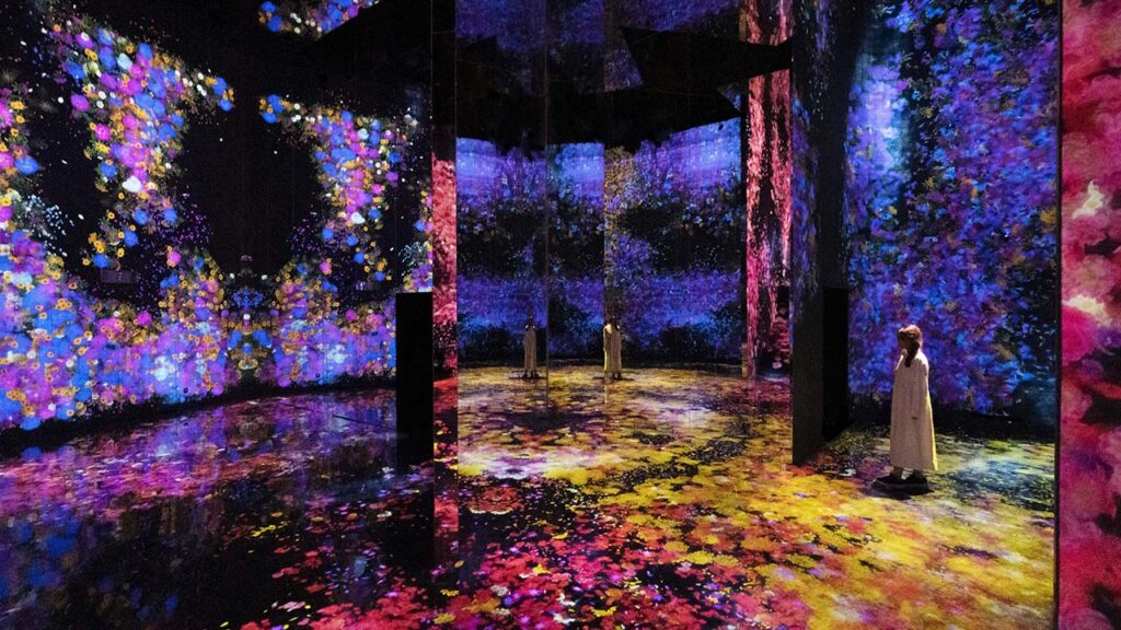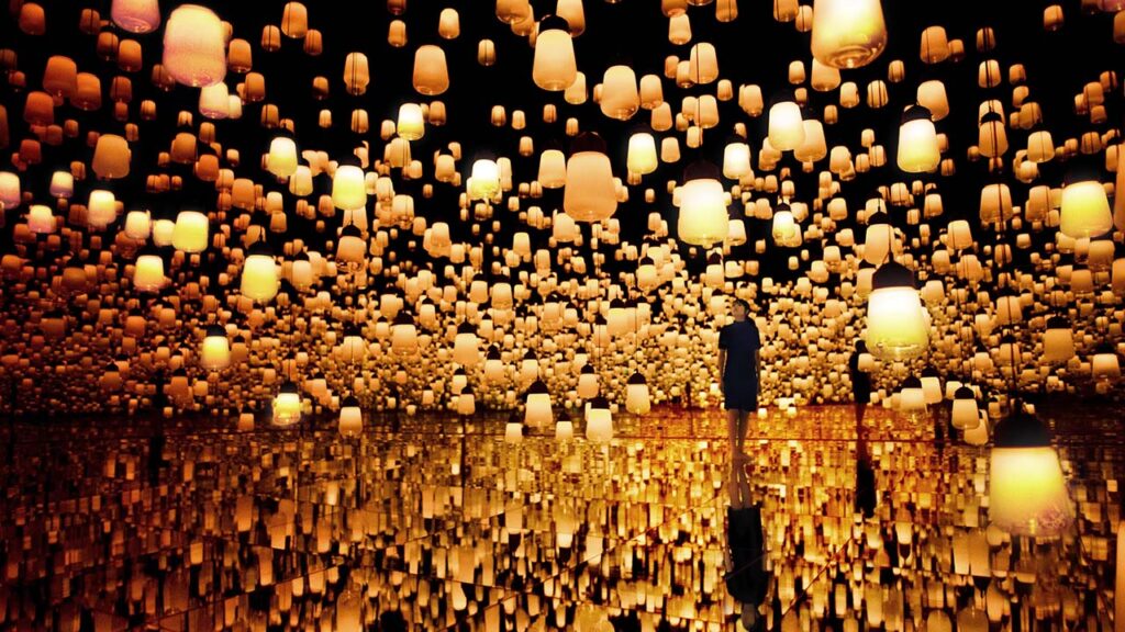 teamLab 的沉浸式空間呈現另一種文化工業邏輯。展館的動線、投影節奏與感知節點均由技術系統與品牌敘事精密編排。作品如《無界》透過連續影像、地面光場與感測器配置導引觀眾在場域內移動,使身體進入由品牌設計的感官序列。體驗高度可預測,具備遊樂園般的流量管理與動線邏輯。作品的成功依賴大量票務收入,而票務結構又反向強化作品的娛樂值,使感知活動逐漸被轉化為企業運營的基礎。