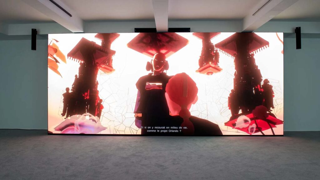 在《BOB:信仰之袋》與《BOB 之後的生命》(Life After BOB, 2021–)(圖 9)中,Cheng 進入更高層級的技術場域。他引入具備神經系統的智能角色,角色能依據環境反饋重新組合行為腳本,模擬由內部衝動驅動的行動邏輯。生成過程的具體時刻由算法自行決定,不再由藝術家控制。作品呈現的場景與事件在運算當下形成,作者的意圖退到邊緣,創作權限分配給演算法代理。此現象形成可稱為後人類作者權,作品的核心不在於藝術家的決定,而在於系統自身的生成能力。
