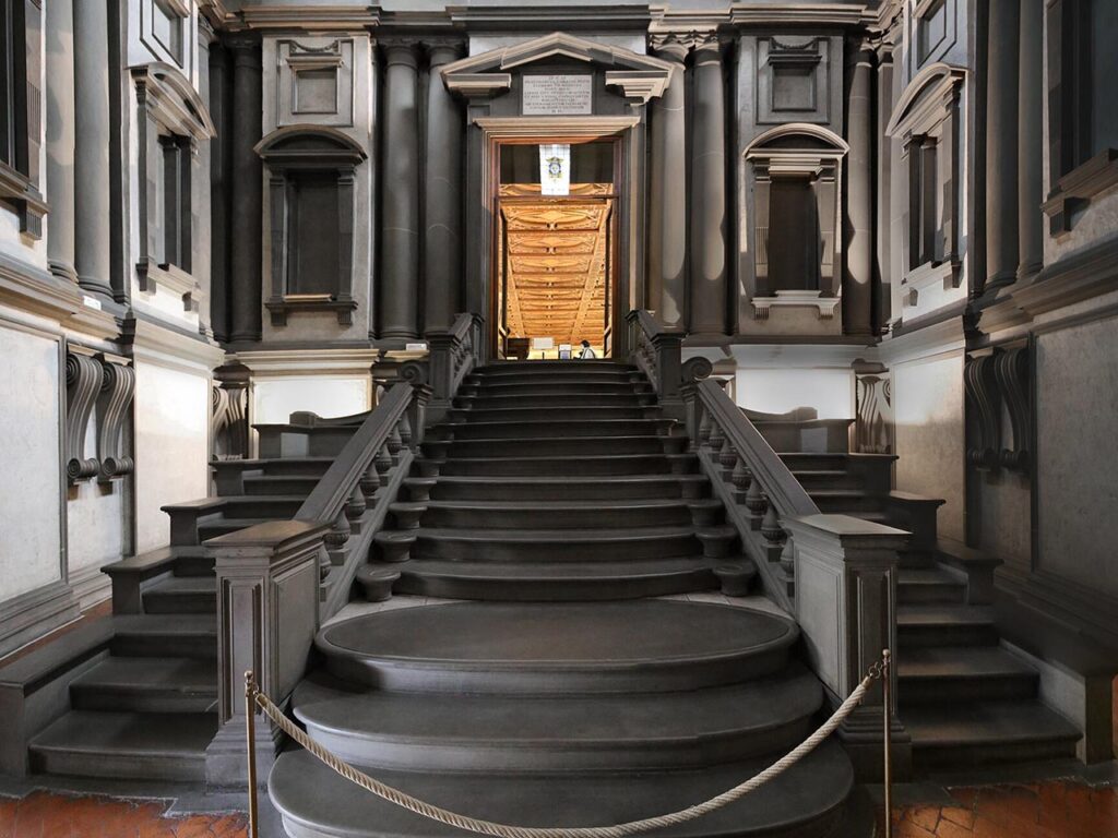 圖 1 :Michelangelo(1475–1564),聖羅倫佐紀念圖書館(Biblioteca Medicea Laurenziana),1524–1571 年。Michelangelo 以雕塑性的階梯與壓迫性的牆身營造強烈的動勢,使空間呈現向前推擠的張力。階梯踏面近似液態的延展感,與側牆厚重的柱式形成對比,打破傳統文藝復興比例的穩定關係。此空間常被視為早期操控動態空間語法的關鍵案例,預示了後續巴洛克對形體與運動感的追求。圖片來源:wikimedia.org