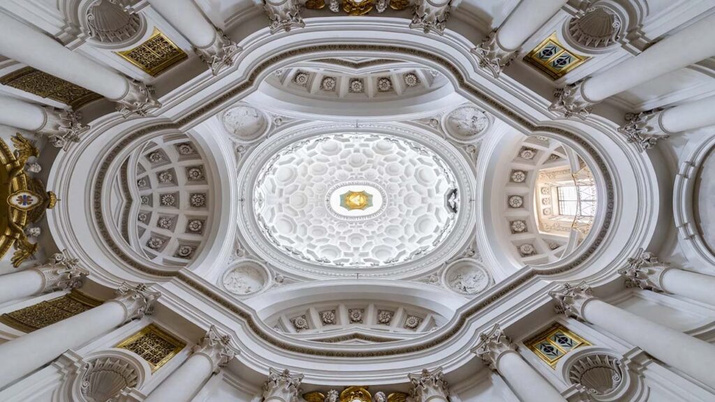 圖 2:Francesco Borromini(1599–1667),聖依納爵堂(San Carlo alle Quattro Fontane),1638–1641 年。Borromini 以橢圓幾何與連續曲面塑造緊縮的室內量體,使空間呈現流動性的張力。穹頂凹槽形成向心動勢,光線沿弧面滑動,強化整體的不穩定感。牆身曲線與立面層次的反覆交替打破文藝復興以來的比例穩固性,被視為巴洛克操作動態空間語法的重要例證。圖片來源:wikiarquitectura.com。