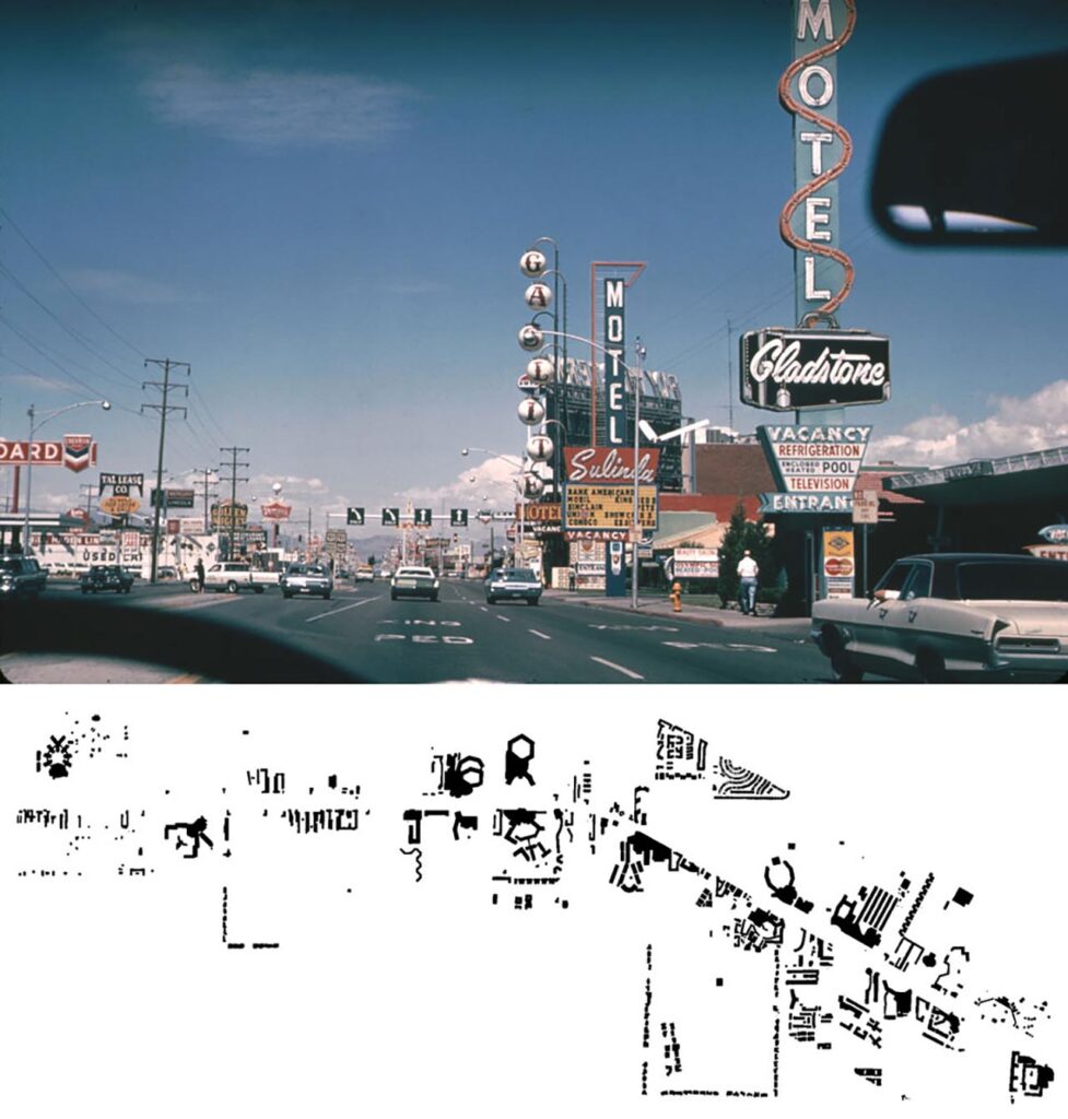 圖 3:Robert Venturi(1925–2018)、Denise Scott Brown 與 Steven Izenour(1940–2001),〈The Strip from the car〉,收入《向拉斯維加斯學習》(Learning from Las Vegas),1972 年。上方照片呈現拉斯維加斯大道的駕駛視角,霓虹招牌、廣告塔與道路基礎設施構成高度密集的符號場域。下方的圖示化轉譯將沿街標誌簡化為平面符號,使視覺節奏、資訊層級與街道結構得以被清晰辨讀。此材料奠定後現代城市分析的重要方法,強化對通俗文化與商業符誌的觀察位置。