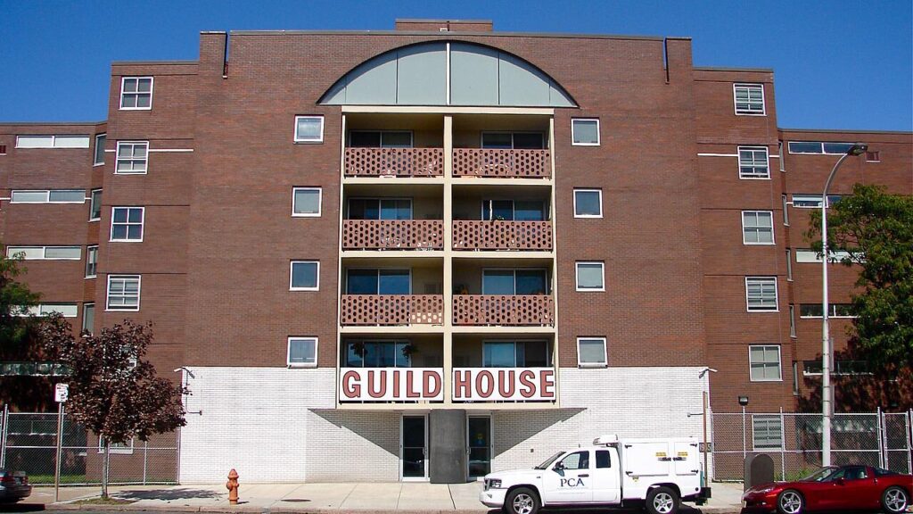 圖 4:Robert Venturi(1925–2018)、Denise Scott Brown 與 John Rauch(1930–2022),《基爾特之家》(Guild House),1963 年。立面運用紅磚、混凝土框架與金屬裝飾構成明確的語意層級,入口上方的「GUILD HOUSE」字樣直接以招牌形式呈現,使建築能被清楚閱讀。中央陽台採用工業化鑄造欄板,刻意凸顯日常材料的文化位置。整體構成反映對現代主義抽象語言的反思,試圖讓建築重新接上地方脈絡與日常生活。圖片來源:wikimedia.org。