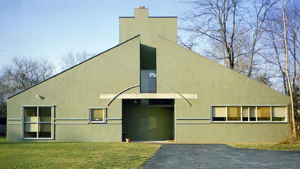圖 5:Robert Venturi(1925–2018),《范娜.范裘利住宅》(Vanna Venturi House),1964 年。立面以對稱與不對稱交錯構成張力,中央開口與煙囪量體切割屋面,使構圖形成明顯的分裂軸線。入口上方的弧形構件削弱立面的嚴整性,窗形比例與水平線條則刻意操控尺度感。整體語法呈現複雜與矛盾的併存,被視為後現代住宅的核心範例,展現對傳統象徵與現代抽象語言的雙重閱讀。圖片來源:archdaily.com。