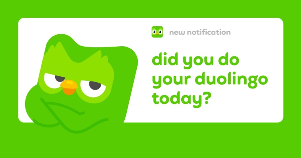 Duolingo 的商業策略高度依賴情緒驅動的設計。通知並非單純提醒,而是經由強盜演算法優化的心理刺激。系統會大量測試訊息內容,從帶有哭泣角色圖像的提示,到「我們再也不會打擾你」等語帶情緒的訊息,找出最能促使用戶重新打開 App 的語句。此類情緒性提醒被視為典型暗黑模式,強調日活躍用戶(Daily Active Users, DAU)而非心理健康或學習品質。連勝機制更進一步將學習塑造成日常義務,用戶在生病或無法上線時仍感到壓力,因為失去連勝象徵著進度中斷與成就崩解。此一設計模式逐漸把語言學習轉換為介於遊戲成癮與社交焦慮之間的行為框架。
