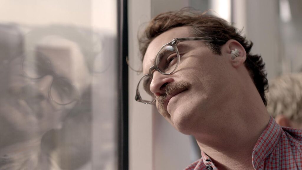 故事以 Theodore Twombly(Joaquin Phoenix 飾)為核心,他的工作是代筆私人書信,生活被孤獨長期包圍。Samantha 以純粹的聲音進入他的日常,從協助排程到提供情感陪伴,逐漸成為他最親密的關係對象。Johansson 的演出完全依賴「聽覺化聲音」(acousmatic voice)¹ 的形式,其發聲來源永遠不被看見。電影理論家指出,未具形體的聲音能在觀眾與角色之間生成近乎觸碰的感受,聲音彷彿直接貼近皮膚,創造比面對面更深的親密強度。視覺不再主導關係形塑,聲音自身成為情動媒介,能以細微情緒震盪調整觀者的注意力與情感節奏。在人工智慧涵構中,這預先呈現了語音介面在感情需求與陪伴焦慮中的地位。今日的 Siri、Alexa、以及 ChatGPT 語音模式所追求的「安撫」與「支持」,正延續了 Samantha 建立的文化模型。