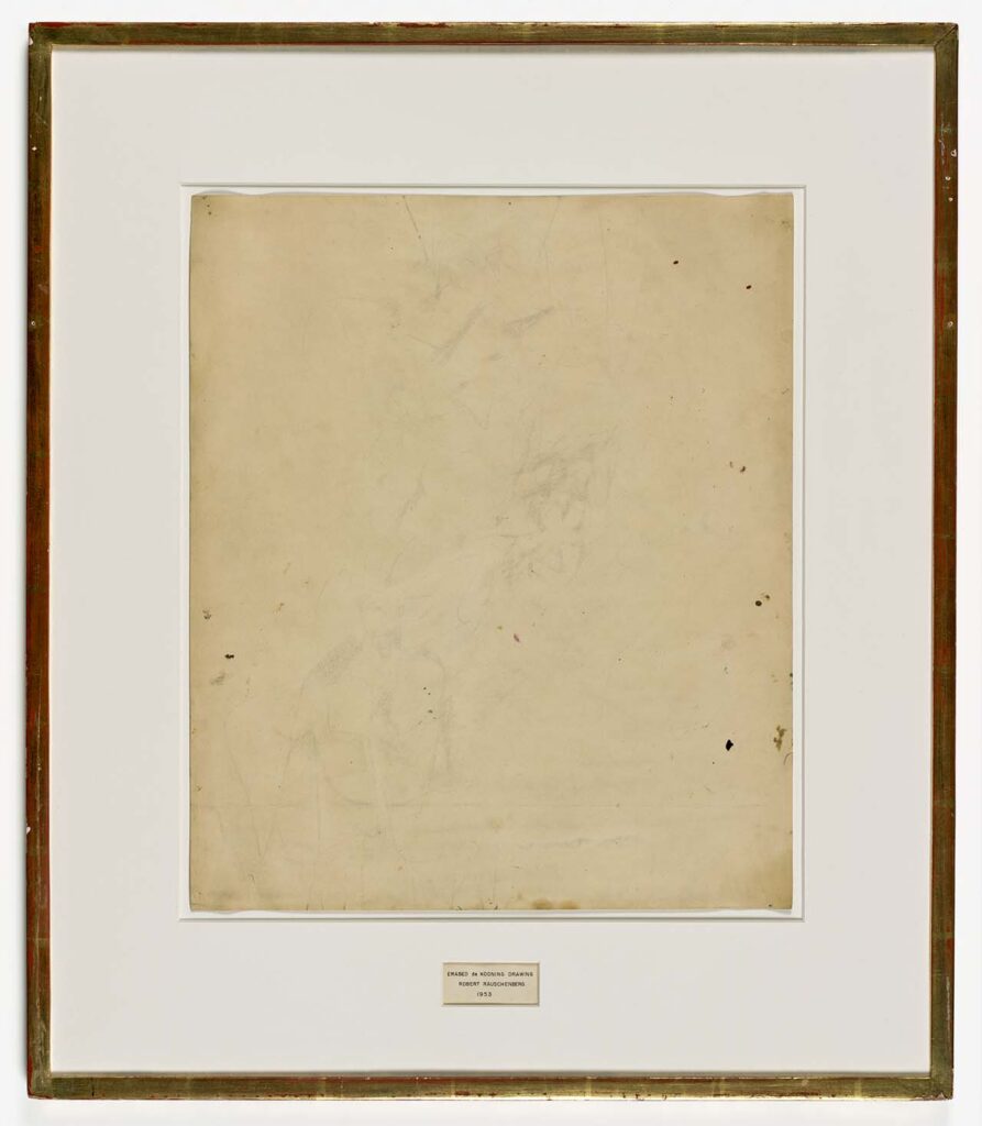 在《Erased de Kooning Drawing》中,Rauschenberg 以極為耗時的擦除行動,消解 Willem de Kooning(1904–1997) 的繪畫痕跡。畫面最終所呈現的,不是新的圖像構成,而是被反覆勞動所留下的空白場域。紙面上殘存的微弱痕跡,標示出時間的累積與行動的持續性。觀看行為因此不再指向圖像的再現,而轉向對缺席狀態的感知。作品的核心不在於可見內容,而在於擦除本身作為事件的存在。