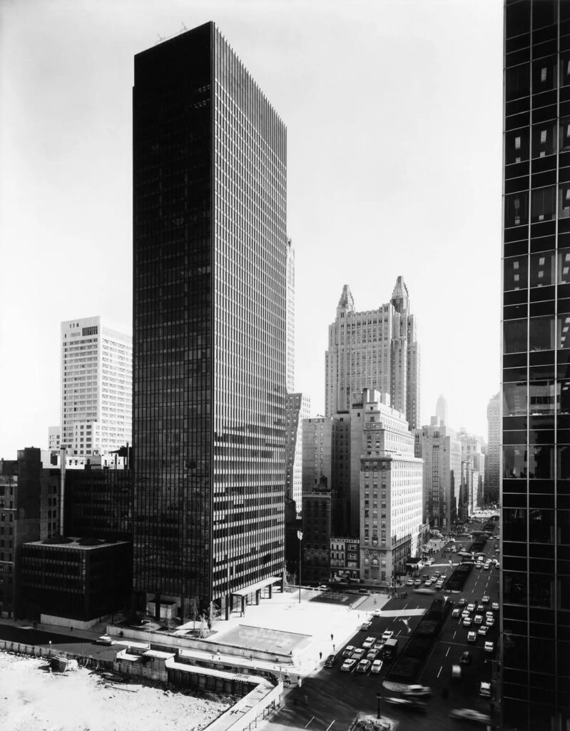 Mies 的摩天大樓以垂直性為核心命題。透過工字鋼(I-beam)在立面上的節奏化處理,向上的動勢被不斷強化,結構細部轉化為視覺秩序的宣告。高度不僅是物理尺度,更成為現代主義戰勝質量與重力的象徵語言。