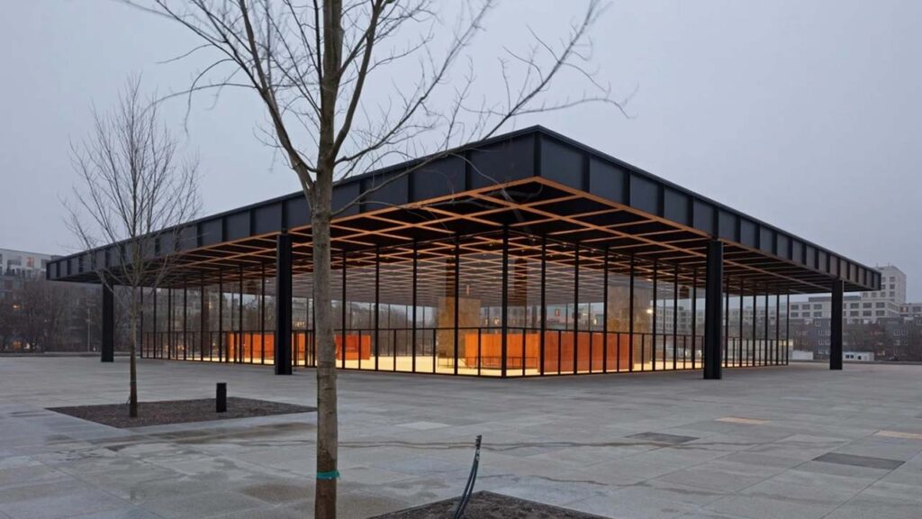 這一原則在《西格拉姆大廈》(Seagram Building, 1958)(圖 2)與《新國家美術館》(Neue Nationalgalerie, 1968)(圖 3)中達到高度凝練的狀態。結構被推至極度自律的位置,材料的節制服務於空間的抽象清晰,而非象徵性的形式表述。其背後所涉及的,則是Mies 在《建築與時代》(Baukunst und Zeitwille, 1924)中反覆強調的結構倫理與形式自我約束 3。
