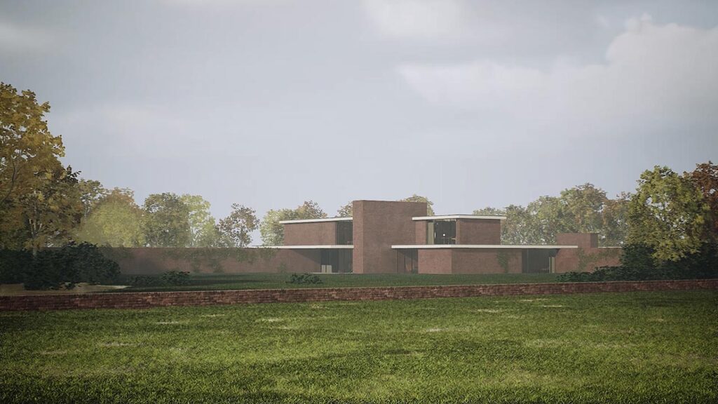 碎化在構成層面與 Mies 早期未建成的《磚造鄉間別墅》(Brick Country House, 1924)(圖 5)形成對照。該計畫中,牆體向外延伸並拒絕封閉盒體,空間以連續方式展開。SANAA 的操作不再停留於平面,而將碎化推入三維結構。八個量體在物理上彼此分離,卻透過空橋、坡道與底層灰空間形成緊密連結。整體關係不建立於單一屋簷下的統攝秩序,而呈現為可被反覆穿越的流動網絡。