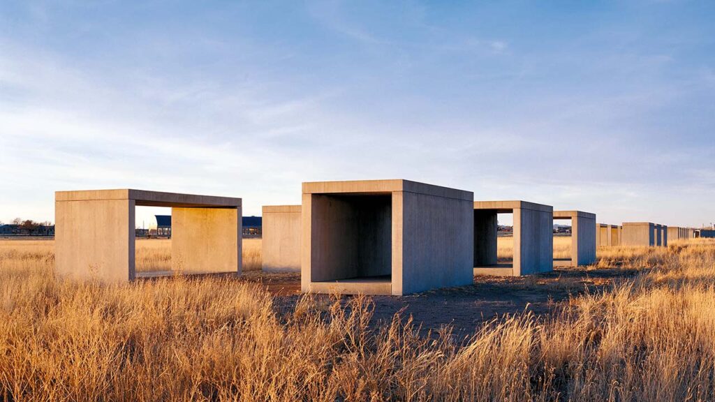 《綠美圖》的八個量體,可被理解為散落於公園中的巨大「特定物體」。這一判讀可與 Judd 的極簡主義實踐形成清楚的對照。Judd 在德州馬爾法(Marfa)草原上配置的混凝土方塊,以幾何原型的姿態直接佔據地景,拒絕裝飾,也拒絕隱喻(圖 7)。作品不指涉外部敘事,只以尺度、材料與重複確立其存在狀態。在 Judd 的理論中,如他在〈特定物體〉所主張的,物體不需要被閱讀,它只是存在於現場。