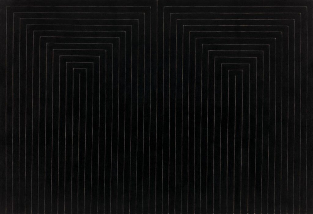 Frank Stella(1936–2024)的名言「你看到的就是你看到的」(What you see is what you see),為極簡主義確立了鮮明的字面性(Literalism)立場 5。在其早期條紋畫(Stripe Paintings)中,畫布的外形直接推導出內部結構,繪畫不再建構幻覺空間,而回到物件自身的尺度、邊界與表面。形式不再承載敘事,也不指向隱喻,只以其可被觀看的狀態存在於當下(圖 8)。