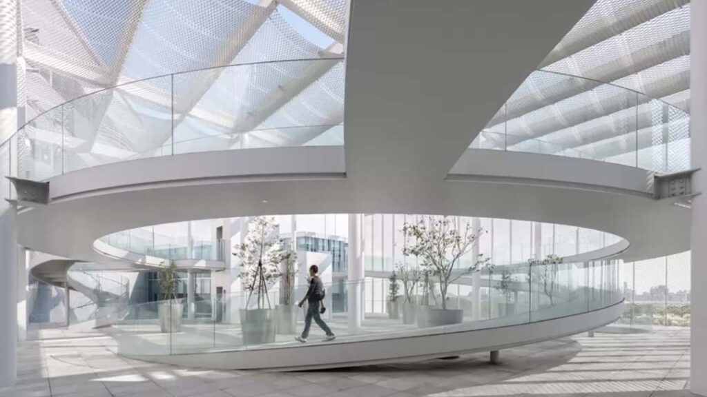 建築漫步不再只是視覺序列的編排,而成為身體與環境共同生成氛圍的過程。透明不僅發生於材料層面,也在運動與視線的交錯中被不斷重寫。中庭、坡道與網格牆共同構成可被行走、可被感受的立體結構,讓空間在上升的過程中逐漸凝聚為連續而統一的氛圍經驗。
