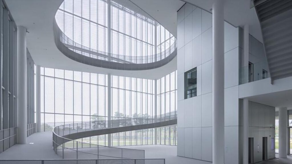 建築呈現出高度可穿透的狀態。低輻射玻璃與擴張鋁網構成半透明的外殼,量體表面帶有近似紗幕的質感。視線得以橫向貫穿建築,人們站在公園一側,穿過大廳與公共空間,仍能辨識另一側地景的延續。透明在此指向材料的物理屬性,光線與視線被允許進入並穿行,內外關係在視覺上被直接攤開。